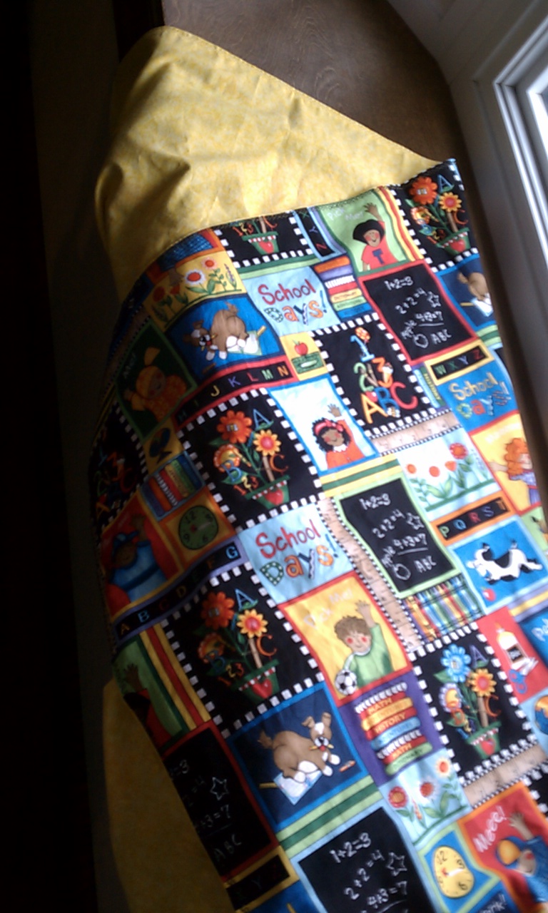 The fabric is 100% cotton so it is fully machine washable and dryable. The fabric on the front is school days as both Layla's parents are teachers. The back is a simple yellow.